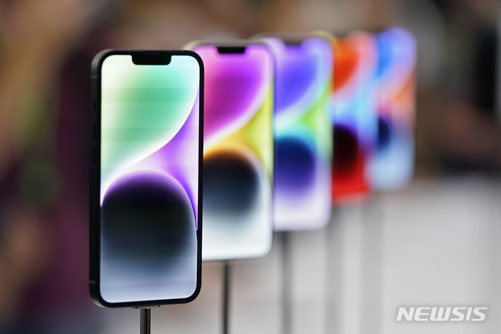 [쿠퍼티노=AP/뉴시스] 애플이 7일(현지시간) 미 캘리포니아주 쿠퍼티노의 애플파크에서 신제품 공개 행사를 열고 아이폰14 시리즈를 선보이고 있다. 애플은 이날 애플워치 시리즈, 에어팟 등을 함께 공개했다. 2022.09.08.