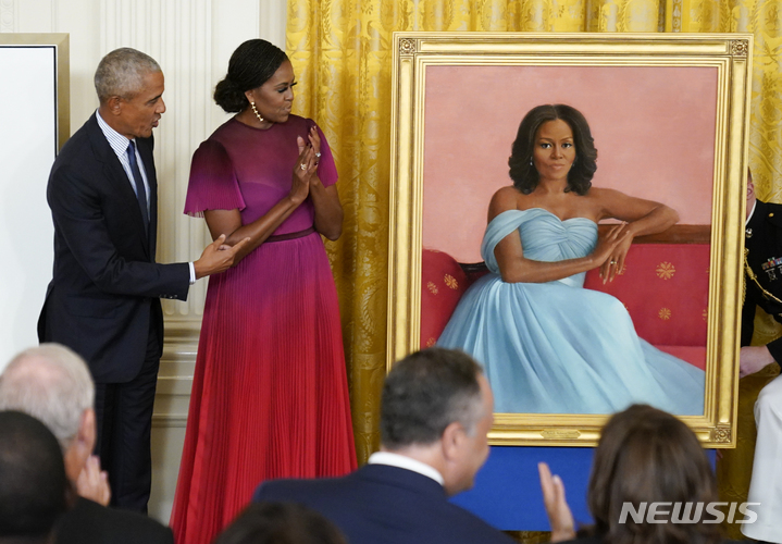 [워싱턴=AP/뉴시스] 버락 오바마 미국 전 대통령과 부인 미셸 오바마 여사가 7일(현지시간) 백악관 이스트룸에서 열린 백악관 초상화 공개 행사에 참석해 초상화를 바라보고 있다. 이 행사는 현직 대통령이 직전 대통령을 백악관에 초청해 당사자의 초상화를 공개하는 전통 행사로 도널드 트럼프 전 대통령 재임 시 중단됐었다. 2022.09.08.