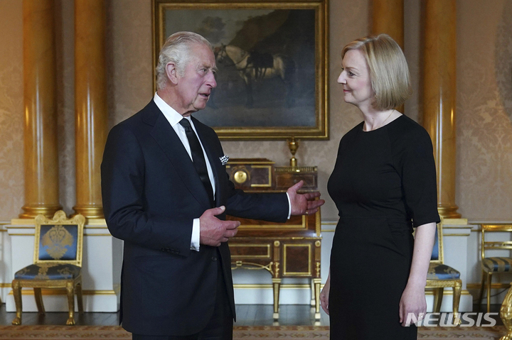 [런던=AP/뉴시스] 찰스 3세 영국 국왕이 9일(현지시간) 런던 버킹엄궁에서 리즈 트러스 총리와 회동하고 있다. 엘리자베스 2세 여왕 서거 후 영국의 새 국왕이 된 찰스 3세는 TV 대국민 연설을 통해 어머니의 뜻을 이어 평생 헌신한 것을 약속했다. 2022.09.10.