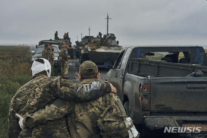 [하르키우=AP/뉴시스] 12일(현지시간) 우크라이나 하르키우 탈환 지역에서 우크라이나군이 이동하면서 한 병사가 부상한 동료를 부축하고 있다. 볼로디미르 젤렌스키 우크라이나 대통령은 이달 들어 러시아가 점령했던 6000㎢의 우크라이나 영토를 탈환했다고 밝히며 "우리 군의 전진이 계속되고 있다"라고 강조했다. 2022.09.13.