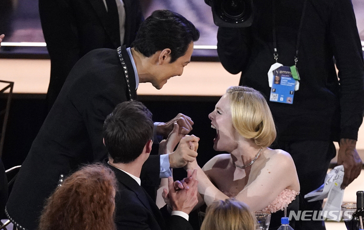 [로스앤젤레스=AP/뉴시스] 배우 이정재가 12일(현지시간) 미 캘리포니아주 로스앤젤레스의 마이크로소프트 극장에서 열린 제74회 에미상 시상식에서 '오징어게임'으로 남우주연상에 호명된 후 미국 배우 엘르 패닝으로부터 축하받고 있다. 2022.09.13.