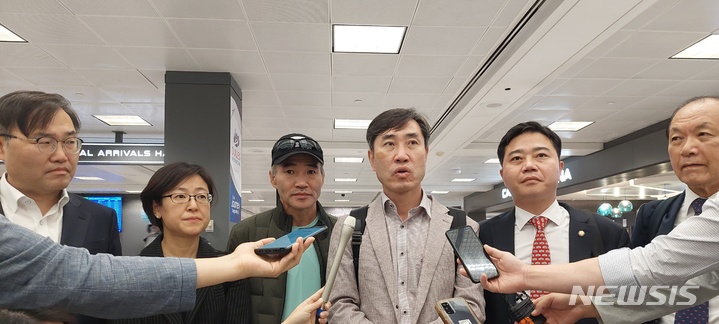 [워싱턴=뉴시스]김난영 기자 = 고(故)이대준씨의 형인 이래진(왼쪽 세번째)씨와 함께 방미한 하태경 국민의힘 의원(왼쪽 네번째)을 비롯한 국민의힘 대표단이 13일(현지시간) 워싱턴 덜레스 국제공항에서 특파원들과 만나 발언하고 있다. [email protected] 2022.09.13.