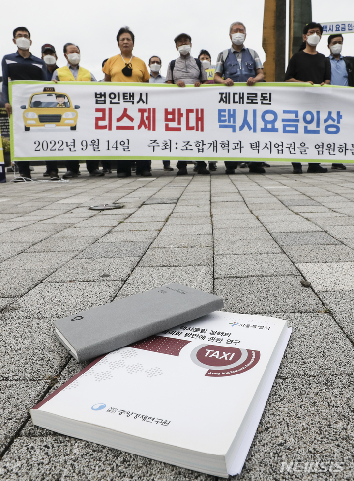[서울=뉴시스] 김근수 기자 = 서울개인택시조합 회원들이 14일 오후 서울 용산구 대통령 집무실 앞에서 법인택시 리스제 도입 반대 집회를 하고 있다. 2022.09.14. [email protected]