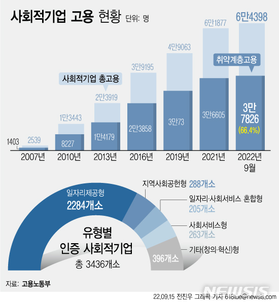 [서울=뉴시스] 고용노동부가 사회적 가치를 추구하며 이윤 활동을 하는 116개 기관을 사회적기업으로 신규 인증했다고 15일 밝혔다. 이번 인증으로 국내에서는 활동하는 사회적기업은 모두 3436개가 된다. 유형별로 보면 취약계층 일자리제공형이 2284개(66.4%)로 가장 많았다. (그래픽=전진우 기자)
