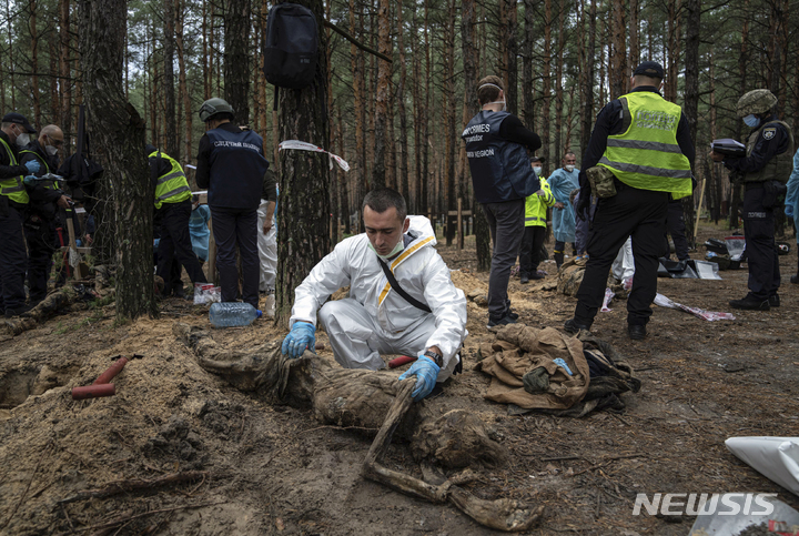 [이지움=AP/뉴시스] 16일(현지시간) 우크라이나 하르키우주 이지움에서 한 조사관이 집단 매장지에서 발굴한 시신을 조사하고 있다. 볼로디미르 젤렌스키 우크라이나 대통령은 이지움 인근 집단 매장지에서 시신 440구를 발견했으며 이 중 많은 시신의 사지가 부러지고 목에 밧줄이 감겨 있는 등 고문과 학살의 흔적이 있었다고 밝혔다. 2022.09.17.