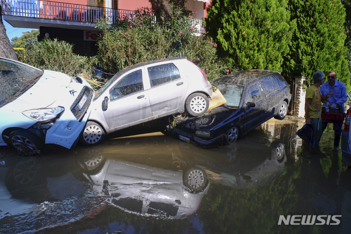 [피아넬로 오스트라=AP/뉴시스] 16일(현지시간) 이탈리아 중부 피아넬로 디 오스트라 도로에 홍수로 떠밀린 차량이 쌓여 있다. 이날 구릉지대 여러 마을에서 폭우로 홍수가 발생, 제방이 범람하면서 최소 10명이 숨지고 4명이 실종된 것으로 알려졌다. 2022.09.17.
