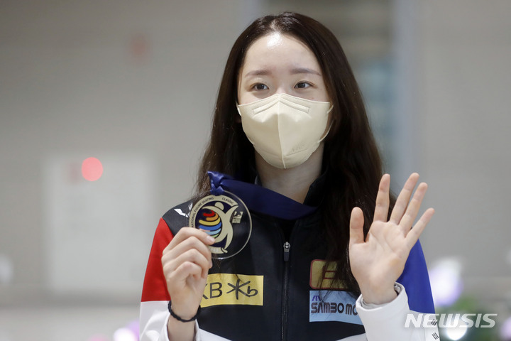 [인천공항=뉴시스] 최동준 기자 = ISU 챌린저 시리즈에서 금메달을 획득한 김예림이 17일 인천국제공항을 통해 귀국 후 포즈를 취하고 있다. 2022.09.17. [email protected]