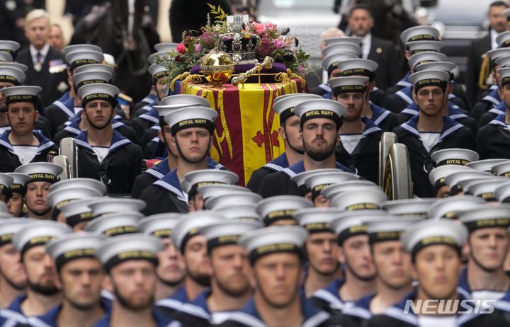 [런던=AP/뉴시스] 영국 왕립 해군 군인들이 19일(현지시간) 영국 런던의 웨스트민스터 홀에서 고 엘리자베스 2세 영국 여왕의 관이 실린 포차를 끌고 장례식장인 웨스트민스터 사원으로 향하고 있다. 2022.09.19.