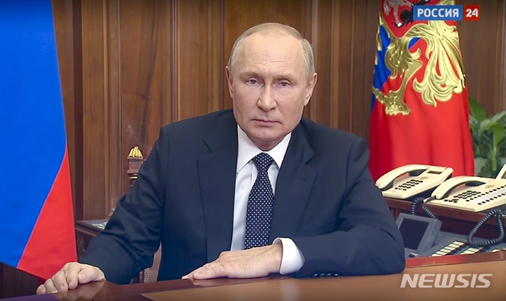 [모스크바=AP/뉴시스] 블라디미르 푸틴 러시아 대통령이 21일(현지시간) 모스크바에서 대국민 연설을 통해 부분 동원령을 발표하고 있다. 푸틴 대통령은 러시아의 주권과 영토를 보전하고, 국민의 안전을 보장하기 위해 부분 동원령을 채택했다고 밝혔다. 2022.09.21.