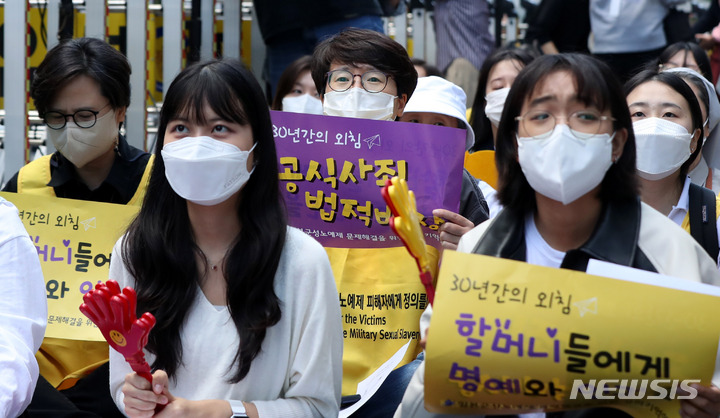 [서울=뉴시스] 추상철 기자 = 21일 오후 서울 종로구 옛 일본대사관 인근에서 열린 '일본군성노예제 문제해결을 위한 제1562차 정기수요시위'에서 참가자가 피켓을 들고 있다. 2022.09.21. [email protected]