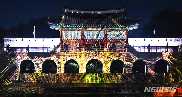 [수원=뉴시스] 김종택기자 = 세계문화유산 수원화성의 야경을 화려하게 수놓을 '2022 수원화성 미디어아트쇼'가 오는 23일부터 다음 달 23일까지 수원화성 화홍문과 남수문, 수원천 일원에서 열린다. 이번 미디어아트쇼는 조선후기 왕권 강화와 개혁정치를 위해 노력했던 정조대왕의 꿈을 '만천명월(萬川明月) : 정조의 꿈 빛이 되다'라는 테마로 연출된다. 사진은 지난 21일 경기도 수원시 팔달구 화홍문에서 펼쳐진 미디어아트쇼 리허설 모습. 2022.09.22. [email protected]