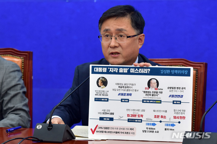 [서울=뉴시스] 고범준 기자 = 김성환 더불어민주당 정책위의장이 22일 서울 여의도 국회에서 열린 정책조정회의에서 영국 엘리자베스 2세 여왕의 장례 참석 등과 관련 손팻말을 들어보이며 발언을 하고 있다. (공동취재사진) 2022.09.22. [email protected]