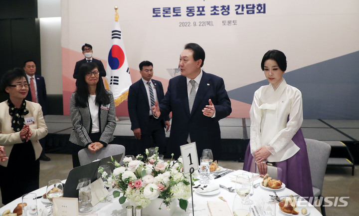 [토론토=뉴시스] 홍효식 기자 = 윤석열 대통령과 부인 김건희 여사가 22일(현지시간) 토론토 한 호텔에서 열린 동포 초청 간담회에 참석해 자리를 권하고 있다. 2022.09.23. [email protected]