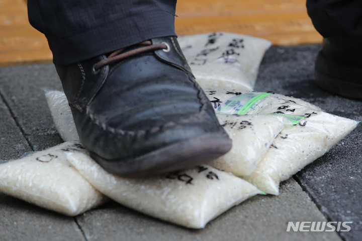 [서울=뉴시스] 권창회 기자 = 전국쌀생산자협회 소속 회원들이 23일 오전 서울 중구 CJ제일제당 본사 인근에서 일부 즉석밥 제품에 수입산 쌀 사용하는것을 규탄하는 기자회견을 하고 있다. 이들은 국산 쌀값 폭락 등으로 인한 농가의 어려움을 호소하며 수입쌀 사용 중단을 촉구했다. 2022.09.23. [email protected]