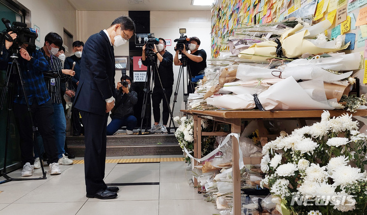 [서울=뉴시스] 윤정민 기자 = 김상범 서울교통공사 사장이 24일 서울 중구 신당역에 마련된 '신당역 스토킹 살해 사건' 희생자 분향소를 찾아 조문하고 있다. 2022.09.24. [email protected]