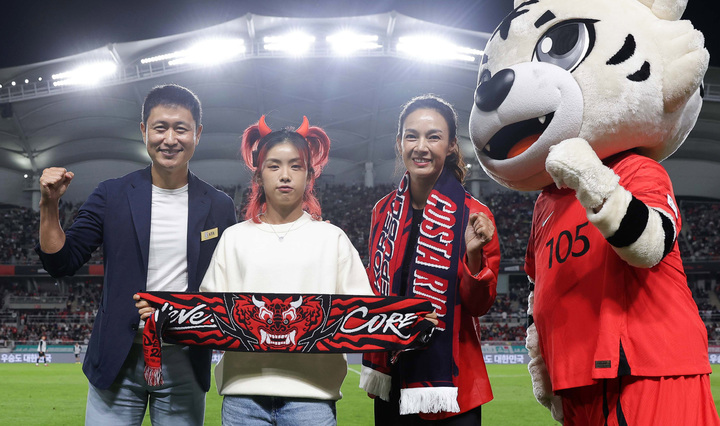 [서울=뉴시스] 김진아 기자 = 2023 아시아축구연맹(AFC) 아시안컵 유치 알림대사 이영표, 아이키, 박선영이 지난 23일 경기 고양종합운동장에서 열린 축구 국가대표팀 평가전 대한민국과 코스타리카의 경기에서 아시안컵 유치 홍보를 하고 있다. (사진=대한축구협회 제공) 2022.09.24. [email protected] *재판매 및 DB 금지