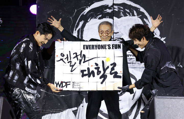 [서울=뉴시스] 이영환 기자 = 배우 오영수가 24일 서울 종로구 대학로 일대에서 열린 '2022 웰컴대학로' 축제 개막식에 참석해 페인터즈와 공연을 하고 있다.(사진=문화체육관광부 제공) 2022.09.25. [email protected] *재판매 및 DB 금지