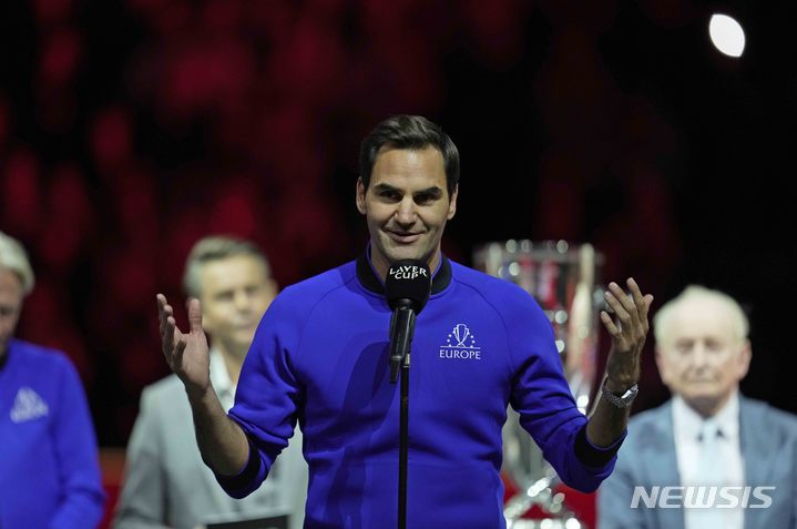 [런던=AP/뉴시스] 테니스 황제 로저 페더러(스위스)가 25일(현지시간) 영국 런던의 O2 아레나에서 레이버 컵 테니스대회를 마치고 인사말을 하고 있다. 이 대회에서 페더러 등 남자 테니스의 '빅4'가 총출동한 '팀 유럽'은 '팀 월드'에 8-13으로 패하며 우승을 내줬다. 2022.09.26.