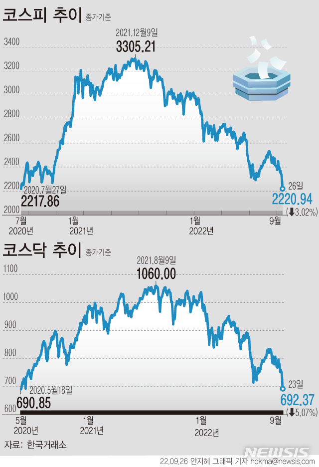 [서울=뉴시스] 26일 코스피가 전 거래일(2290.00)보다 69.06포인트(3.02%) 내린 2220.94에 장을 닫았다. 이는 종가 기준 지난 2020년 7월27일(2217.86) 이후 최저치다.