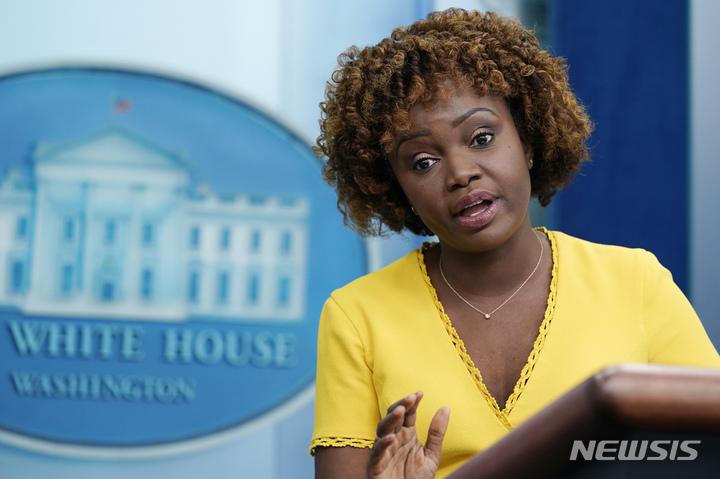 [워싱턴=AP/뉴시스] 카린 장-피에르 백악관 대변인이 26일(현지시간) 백악관에서 일일 브리핑을 하고 있다. 장-피에르 대변인은 "러시아의 합병 주민투표가 국제법을 명백하게 위반한 사기 투표"라며 "러시아가 합병을 추진하면 동맹국 및 파트너들과 함께 경제적 비용을 추가로 부과할 준비가 돼 있다"라고 말했다. 2022.09.27.