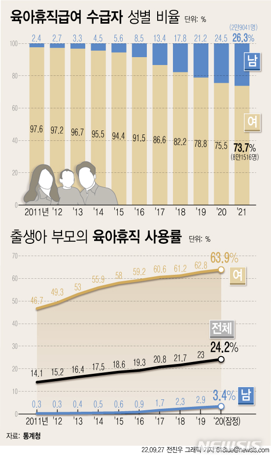 [그래픽] 직장인 육아휴직 비율 24%…男 3% 그쳐