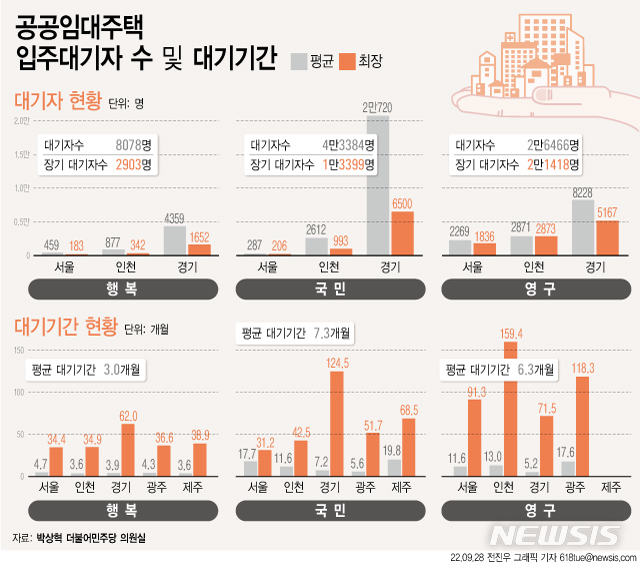 [서울=뉴시스] 28일 국회 국토교통위원회 소속 박상혁 더불어민주당 의원이 한국토지주택공사(LH)로부터 제출받은 '임대주택 입주대기자 현황' 자료에 따르면 전국 행복주택 대기자는 8078명, 국민임대는 4만3384명, 영구임대는 2만6466명으로 조사됐다. 1년 이상 입주를 기다린 장기 대기자 수는 총 3만7720명에 달하는 것으로 집계됐다. (그래픽=전진우 기자)