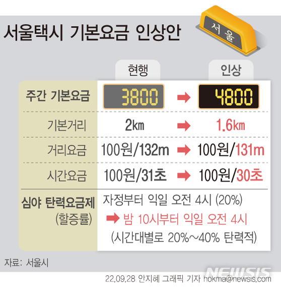 [그래픽] 내년부터 서울 택시 기본료 4800원으로 인상