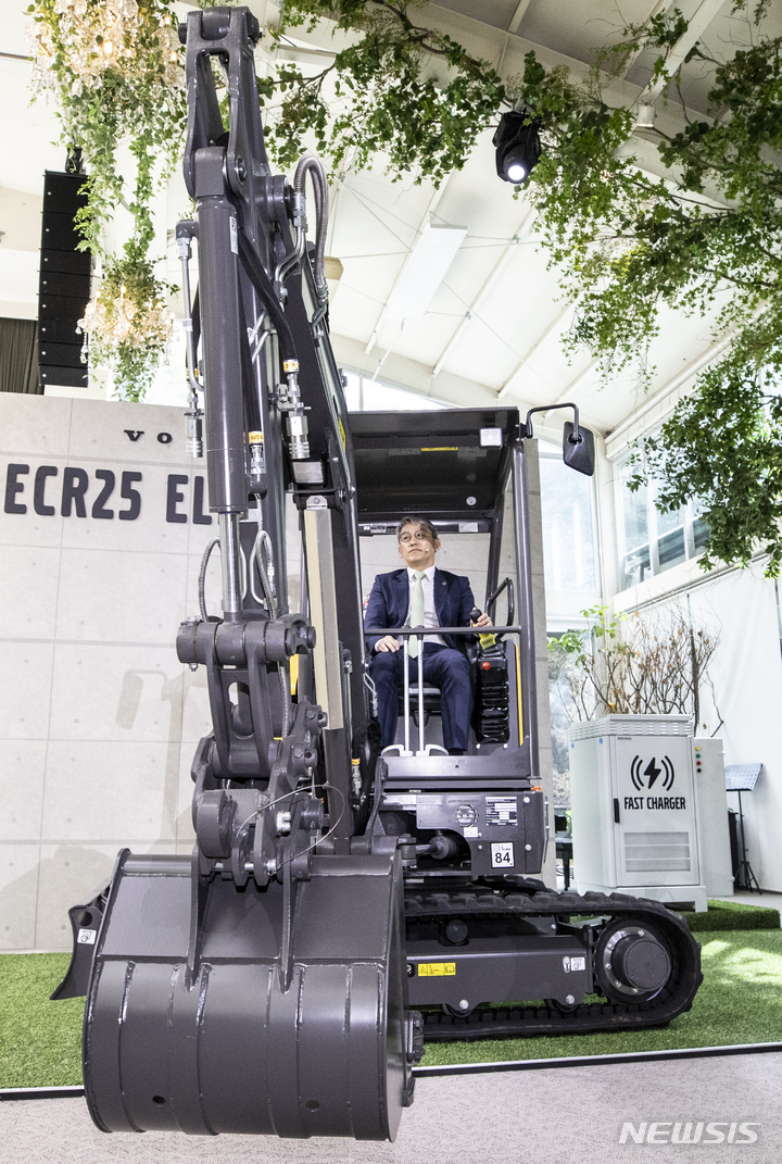 [서울=뉴시스] 김근수 기자 = 임재탁 볼보건설기계 국내영업서비스 부사장이 28일 오전 서울 중구 크레스트 72에 열린 볼보건설기계 코리아 순수 전기 굴착기 'ECR 25' 출시 미디어 행사에서 시범운행을 하고 있다. 2022.09.28. [email protected]