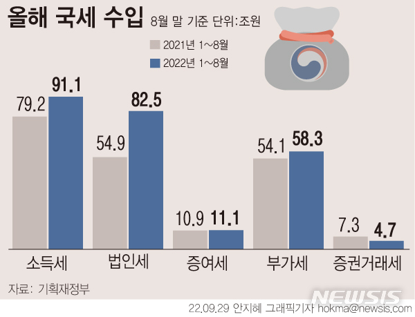 [서울=뉴시스] 29일 기획재정부에 따르면 올해 1~8월 누계 국세수입은 289조3000억원으로 지난해 같은 기간보다 41조원 증가했다. 기업실적 개선으로 법인세가 호조를 보였으며 고용 및 소비 증가 등으로 소득세와 부가가치세도 증가했다. 주식거래 둔화로 증권거래세는 전년 동월 대비 2조6000억원(-35.9%) 줄었다. (그래픽=안지혜 기자)