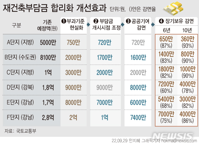 [서울=뉴시스] 정부가 도심 주택 공급이 활발히 이뤄질 수 있도록 재건축 부담금을 대폭 낮춘다. 면제금액 기준을 상향 조정하고, 장기보유중인 1세대1주택자에 대해선 보유기간에 따라 부담금을 최대 50% 추가 감면한다. (그래픽=안지혜 기자)