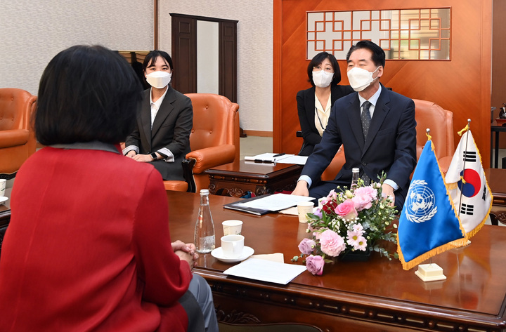 [서울=뉴시스] 이영환 기자 = 김성호 행정안전부 재난안전관리본부장이 29일 오후 서울 종로구 정부서울청사 대회의실에서 마미 미즈토리(Mami Mizutori) UNDRR 특별대표와 간담회를 하고 있다. (사진=행정안전부 제공) 2022.09.29. [email protected] *재판매 및 DB 금지