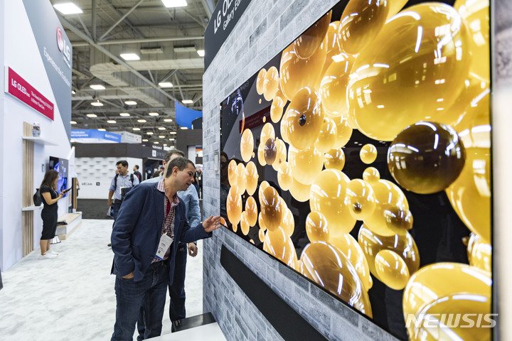[댈러스=AP/뉴시스] 29일(현지시간) 미 텍사스주 댈러스에서 열린 국제영상가전전시회(CEDIA) LG 디스플레이 전시관에서 한 관람객이 두께 29㎜에 불과한 LG 올레드 갤러리 시리즈 TV를 살펴보고 있다. 2022.09.30.