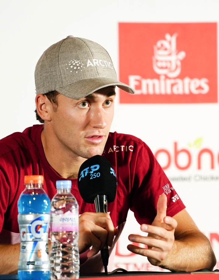 [서울=뉴시스] 테니스 세계랭킹 2위 캐스퍼 루드(노르웨이)가 지난 29일 서울 송파구 올림픽공원 테니스코트에서 열린 ATP '유진증권 코리아 오픈' 2회전에서 니콜라스 자리(111위)를 2대1(6-2 3-6 6-3)로 꺾고 8강에 진출했다. 캐스퍼 루드가 경기 후 인터뷰를 하고 있다. (사진=유진증권 코리아오픈 제공) 2022.09.30. [email protected] *재판매 및 DB 금지