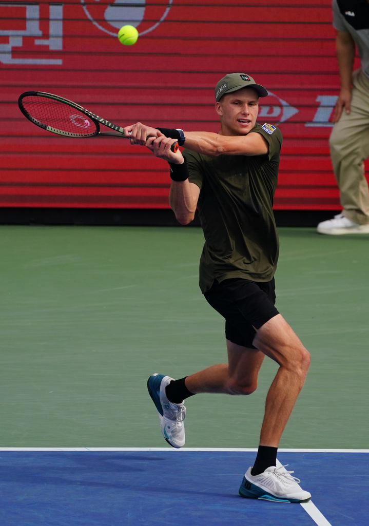 [서울=뉴시스] 조수정 기자 = 젠슨 브룩스비가 1일 서울 송파구 올림픽공원 테니스코트에서 열린 ATP 250 유진투자증권 코리아오픈 테니스대회 단식 준결승 데니스 샤포발로프와의 경기에서 리턴샷 하고 있다. (사진=유진투자증권 코리아오픈 대회 조직위원회 제공) 2022.10.01. [email protected]