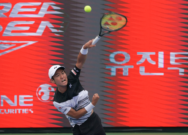 [서울=뉴시스] 조수정 기자 = 요시히토 니시오카가 1일 서울 송파구 올림픽공원 테니스코트에서 열린 ATP 250 유진투자증권 코리아오픈 테니스대회 단식 준결승전 알렉산더 코바세빅과 경기하고 있다. 결과는 세트스코어 2-1로 니시오카 결승 진출. (사진=유진투자증권 코리아오픈 대회 조직위원회 제공) 2022.10.01. [email protected] *재판매 및 DB 금지
