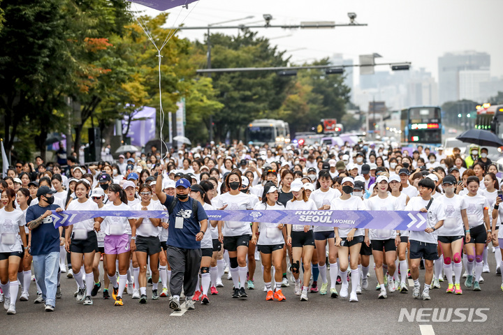 [서울=뉴시스] 정병혁 기자 = 2일 오전 서울 영등포구 여의도공원에서 열린 2022 뉴발란스 런온 서울 우먼스에서 참가자들이 출발선으로 들어서고 있다. 2022.10.02. [email protected]