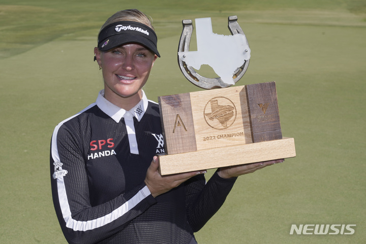 [더콜로니=AP/뉴시스] 찰리 헐(영국)이 2일(현지시간) 미 텍사스주 더콜로니의 올드 아메리칸 GC에서 열린 미국여자프로골프(LPGA) 투어 어센던트 LPGA 정상에 올라 트로피를 들고 포즈를 취하고 있다. 헐은 최종 합계 18언더파 266타로 우승, 투어 2승째를 거뒀다. 2022.10.03.