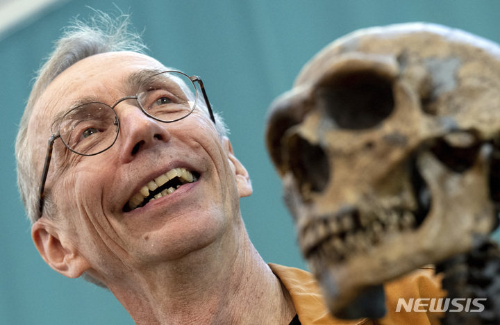 [라이프치히=AP/뉴시스] 스웨덴의 유전학자 스반테 페보 교수가 3일(현지시간) 독일 라이프치히에 있는 막스 플랑크 진화 인류학 연구소 네안데르탈인 골격 복제품 옆에서 웃음 짓고 있다. 앞서 노벨상위원회는 페보 교수를 2022 노벨 생리의학상 수상자로 선정, 발표했다. 2022.10.04.