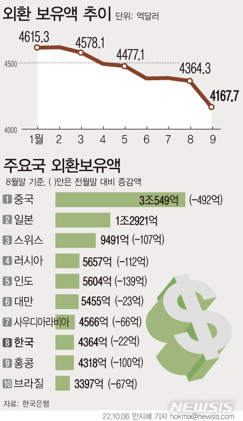 [서울=뉴시스] 외환 당국이 환율 안정을 위해 달러화 매도에 나서면서 지난달 우리나라의 외환보유액이 200억 달러 가까이 줄었다. 감소폭도 금융위기 이후 근 14년 만에 최대폭을 기록했다. (그래픽=안지혜 기자)