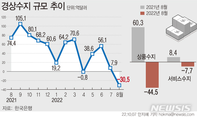 [서울=뉴시스] 국제유가 등 원자재 가격 상승의 여파로 올해 8월 경상수지가 30억5000만 달러 적자 전환했다. 상품수지는 44억5000만 달러 적자로 2개월 연속 적자를 기록했다. 서비스수지도 7억7000만 달러 적자로 나타나 지난해 4월 이후 4개월 만에 다시 적자 전환했다. (그래픽=안지혜 기자)