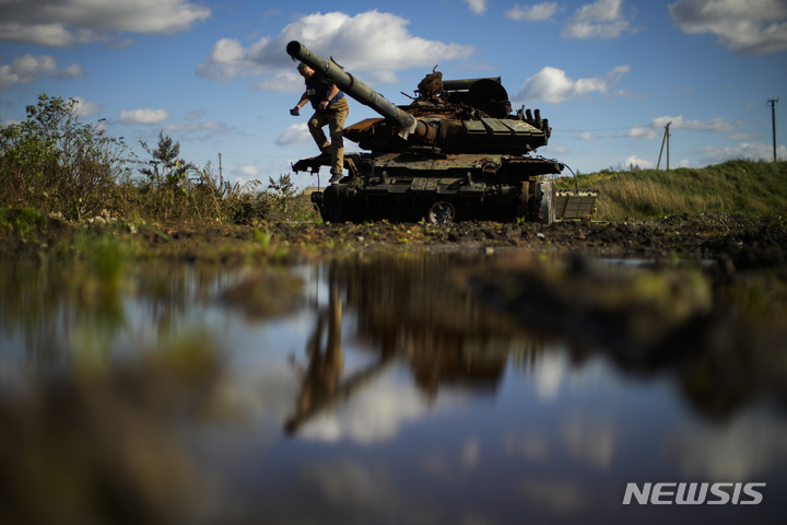 [치스토보디우카=AP/뉴시스] 6일(현지시간) 우크라이나 치스토보디우카 마을에서 우크라이나 군인이 파괴된 러시아 전차에서 뛰어내리는 모습이 물에 비치고 있다. 2022.10.07.