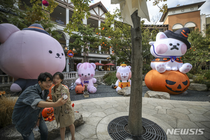 [시흥=뉴시스] 정병혁 기자 = 7일 오후 경기 시흥시 신세계사이먼 시흥 프리미엄아울렛을 찾은 시민들이 센트럴가든에 설치된 젤리크루와 공동으로 국캐대표 선발전에 선정된 캐릭터 에어벌룬 앞에서 사진을 찍고 있다. 신세계사이먼 시흥 프리미엄 아울렛에서는 오는 30일까지 할로윈 캐릭터 유니버스를 진행한다. 2022.10.07. [email protected]