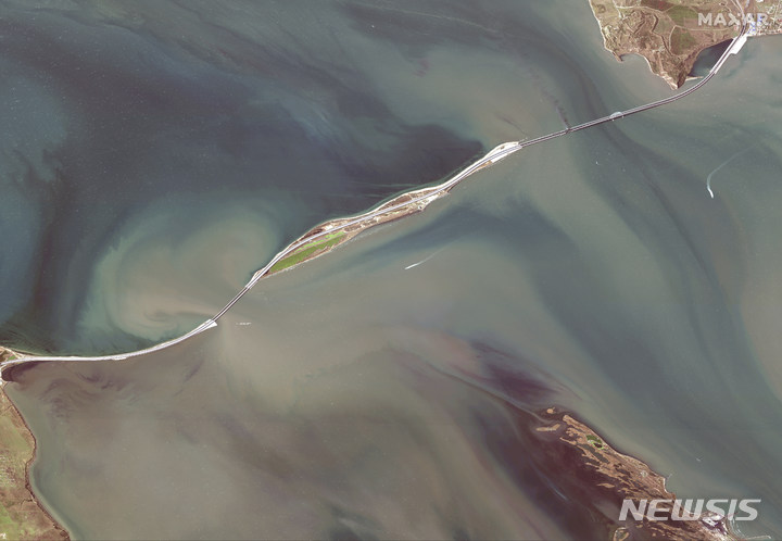 [케르치=AP/뉴시스] 막사 테크놀로지스가 제공한 적외선 위성사진에 8일(현지시간) 러시아 본토와 크림반도를 연결하는 크림대교(케르치해협 대교)에서 폭발이 일어나(사진 오른쪽) 자동차 다리 일부가 붕괴하고 철교에서 불꽃과 연기가 피어오르고 있다. 2022.10.09.
