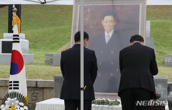 [서울=뉴시스] 김금보 기자 = 10일 오전 서울 용산구 효창공원에서 열린 이봉창 의사 순국 90주기 추모식에서 참석자들이 헌화 및 분향하고 있다. 2022.10.10 [email protected]
