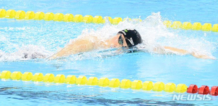 [울산=뉴시스] 배병수 기자 = 황선우(강원도청)가 10일 오후 울산 남구 문수실내수영장에서 열린 103회 전국체육대회 수영 남자일반부 자유형 200m 경기에서 역영하고 있다. 2022.10.10. [email protected]