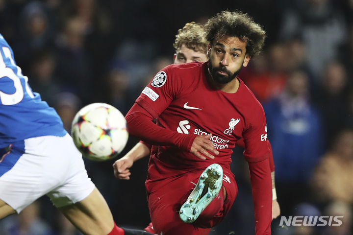 [글래스고=AP/뉴시스] 리버풀의 모하메드 살라가 12일(현지시간) 스코틀랜드 글래스고의 아이브록스 스타디움에서 열린 2022-23 유럽축구연맹(UEFA) 챔피언스리그(UCL) 조별리그 A조 4차전 레인저스와 경기 후반 36분 팀의 6번째 골을 넣고 있다. 살라는 후반 교체 출전해 6분 12초 만에 3골을 넣어 UCL 사상 최단 시간 해트트릭을 기록했고 리버풀은 7-1로 대승했다. 2022.10.13.
