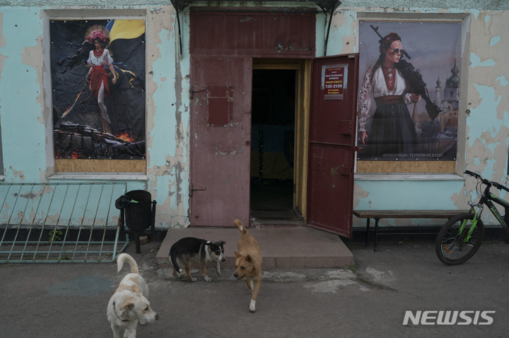 [벨리카 코스트롬카=AP/뉴시스] 13일(현지시간) 우크라이나 드니프로페트로우스크주 벨리카 코스트롬카 커피숍 입구에 개들이 서성거리고 있다. 무기를 든 우크라이나 여성들의 포스터가 커피숍에 걸려 있다. 2022.10.14.