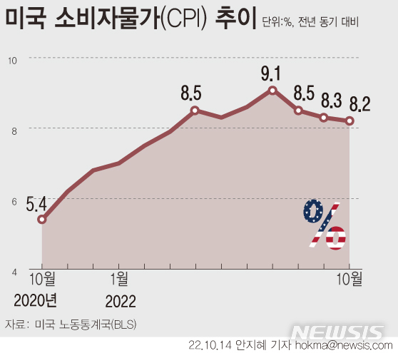 [서울=뉴시스] 미국 노동부에 따르면 9월 소비자물가지수(CPI)가 전년 동월대비 8.2% 상승했다. 전월대비로는 0.4% 상승했다. 우리 정부는 미 소비자물가지수 발표 후 금융시장 불확실성이 확대됐다고 진단하며 시장 쏠림 시 적기에 조치할 계획이라고 밝혔다. (그래픽=안지혜 기자)