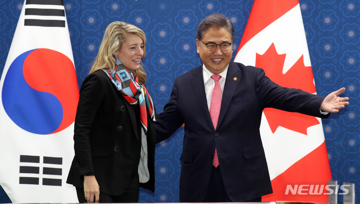 [서울=뉴시스] 김명원 기자 = 박진 외교부 장관이 14일 오전 서울 종로구 외교부에서 열린 한-캐나다 외교장관회담에 앞서 멜라니 졸리 캐나다 외무장관과 인사후 자리를 안내하고 있다. (공동취재사진) 2022.10.14. [email protected]