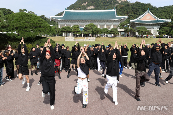 [서울=뉴시스] 조성우 기자 = 케이팝(K-POP) 커버댄스 페스티벌 서울 월드 파이널 최종 결선을 하루 앞둔 14일 오전 서울 종로구 청와대 경내에서 세계 각국의 커버댄스 우승팀들이 플래시몹을 하고 있다. 2022.10.14. [email protected]
